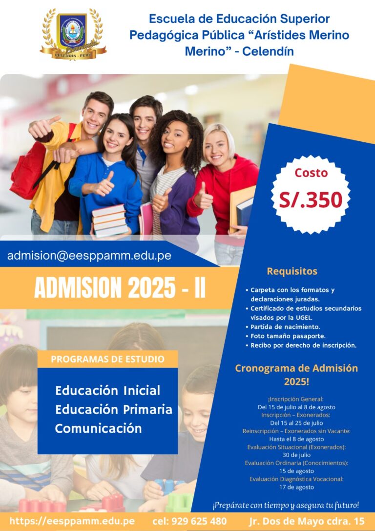 La Escuela de Educación Superior Pedagógica Pública “Arístides Merino Merino” de Celendín, convoca a examen de admisión 2025 – II en el programa de estudio de Educación Inicial, Educación Primaria y Comunicación